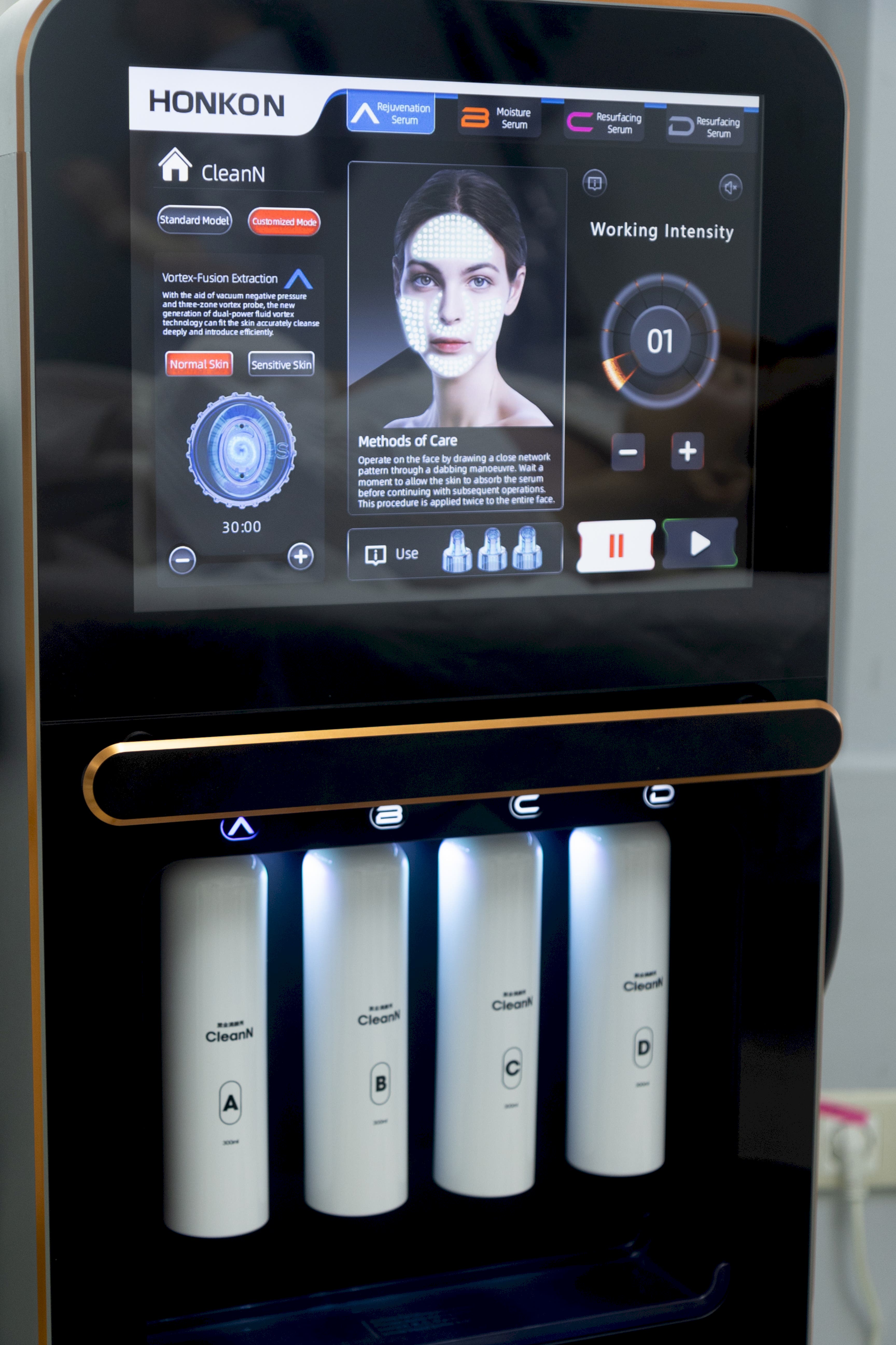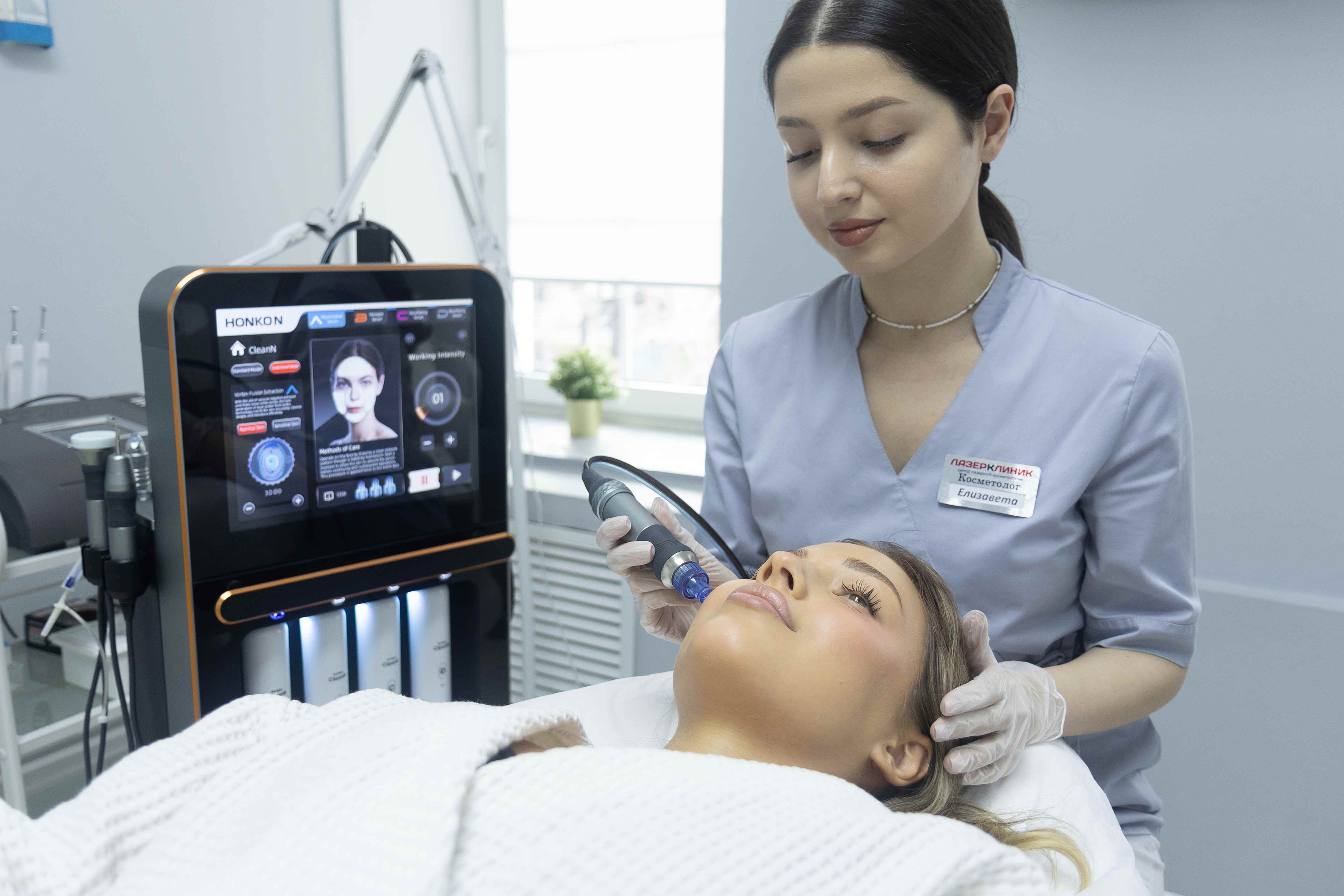 Процесс аппаратного пилинга проводится специальной спиральной насадкой, в которой создается вакуум, он поглощает все загрязнения. Одновременно с этим на кожу подаётся коктейль из необходимых веществ и Пин Ап впитывается в кожу.